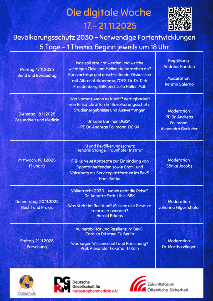 5 Tage, je 2 Vorträge- Thema: Bevölkerungsschutz 2030 – Notwendige Fortentwicklungen